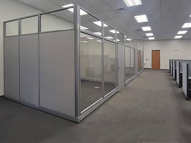 Our proficient office space planning team suggested the utilization of our incredibly versatile and affordable modular wall system, which was strategically arranged to create three offices along one wall and three adjacent offices on the opposite side. The facades were constructed with our modular glass office wall system, resulting in a sleek, modern aesthetic and allowing light to flow through the office space, while maintaining a physical separation between workspaces.